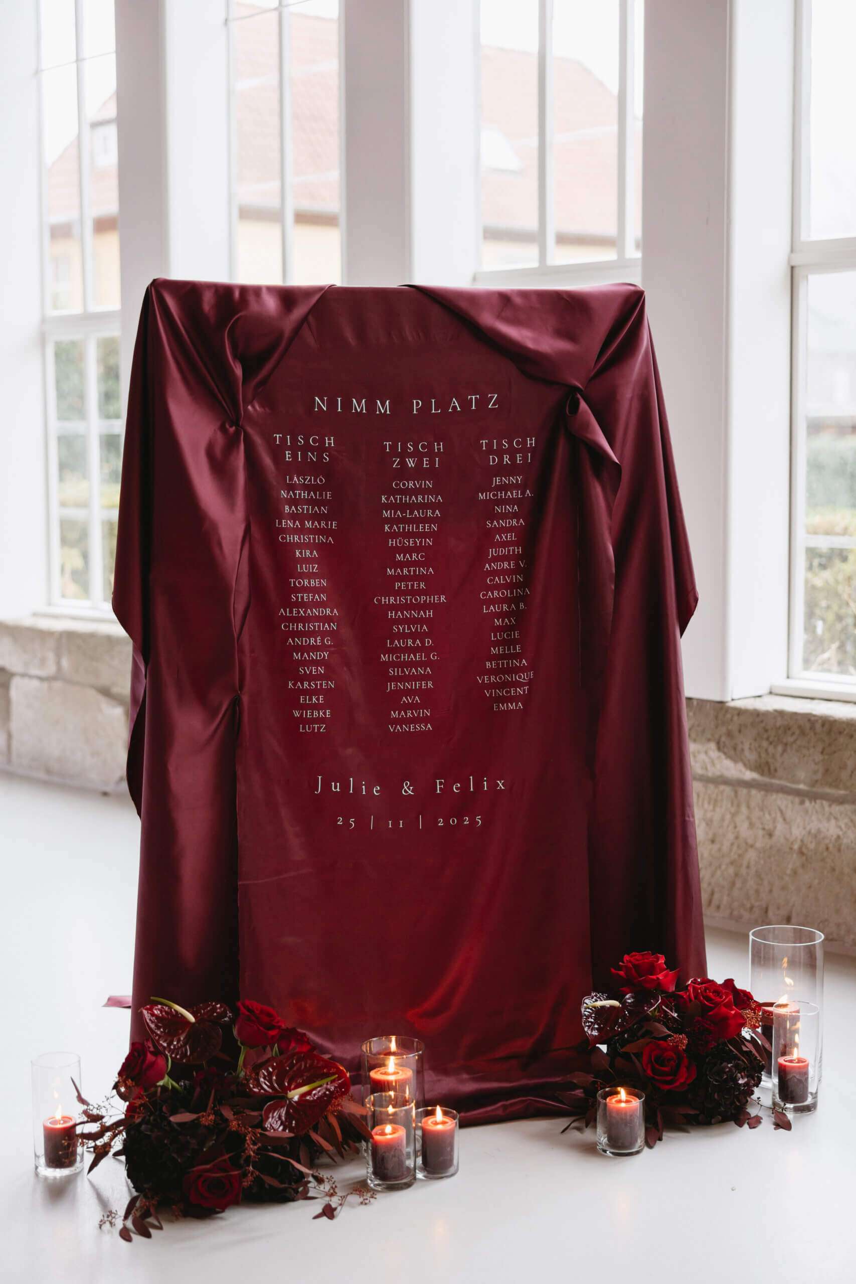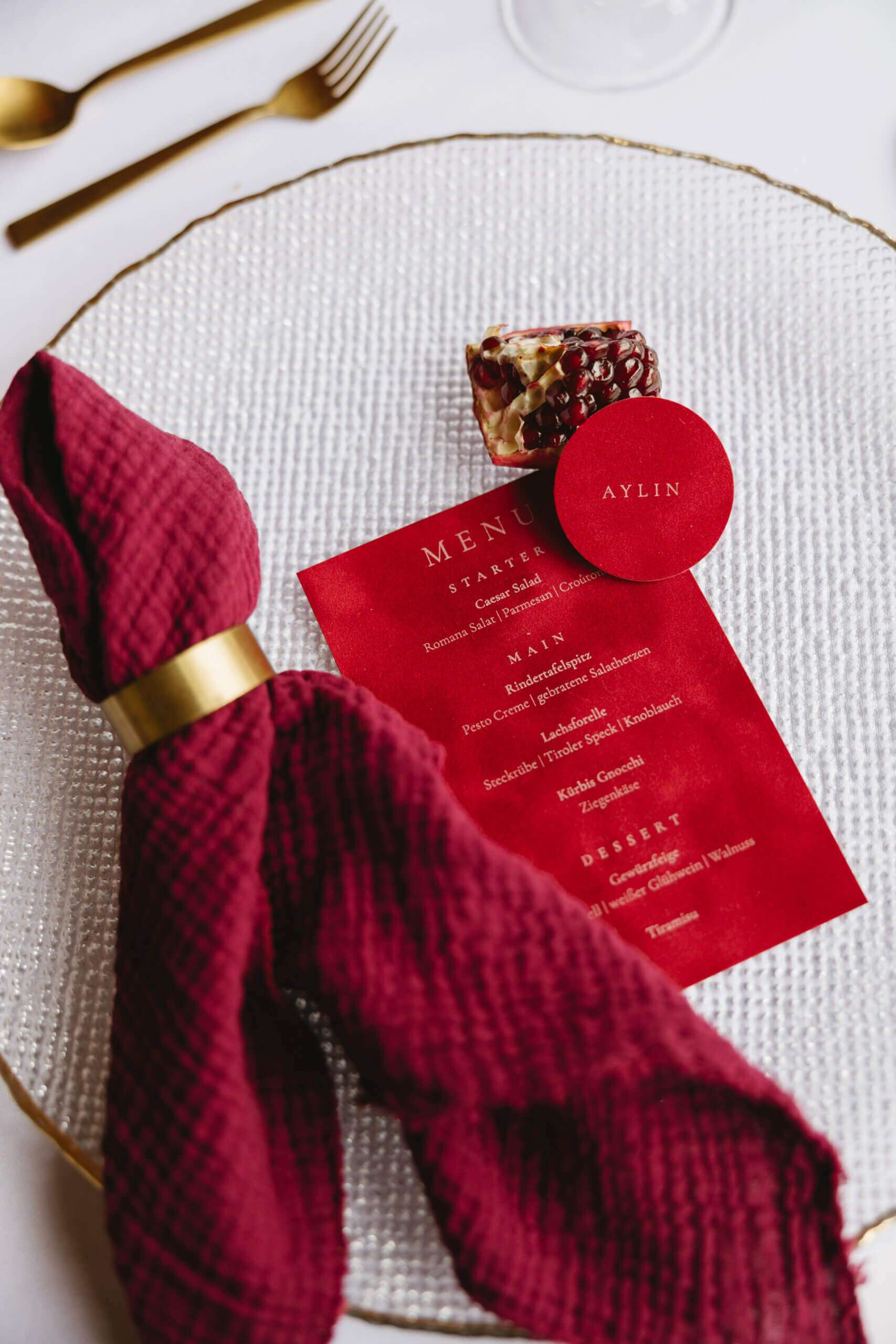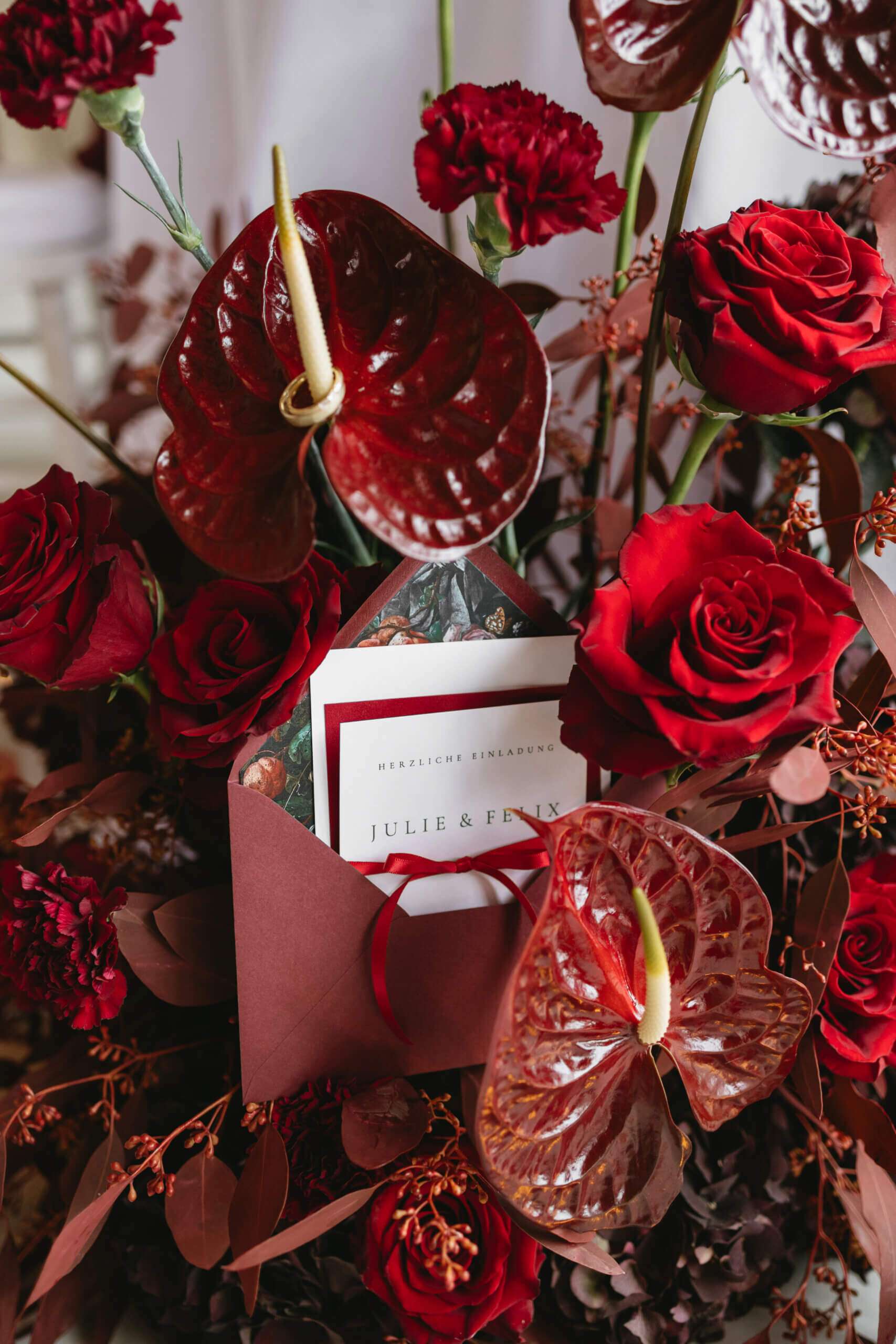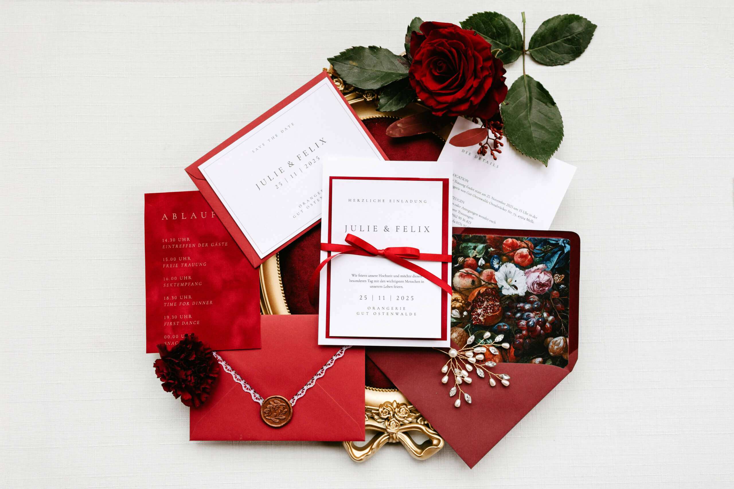 Red Velvet – Bei der Gestaltung dieser Kollektion hatte ich eine Hochzeit voller Eleganz, Tiefe und sinnlicher Details vor Augen. Es ist eine Hommage an die klassische Romantik, kombiniert mit einem modernen, fast barocken Twist. Tiefe Rottöne, opulente florale Stillleben und edle Akzente verschmelzen zu einer Papeterie, die perfekt zu glamourösen Winterhochzeiten, festlichen Schloss-Events oder stimmungsvollen „Moody Weddings“ passt.